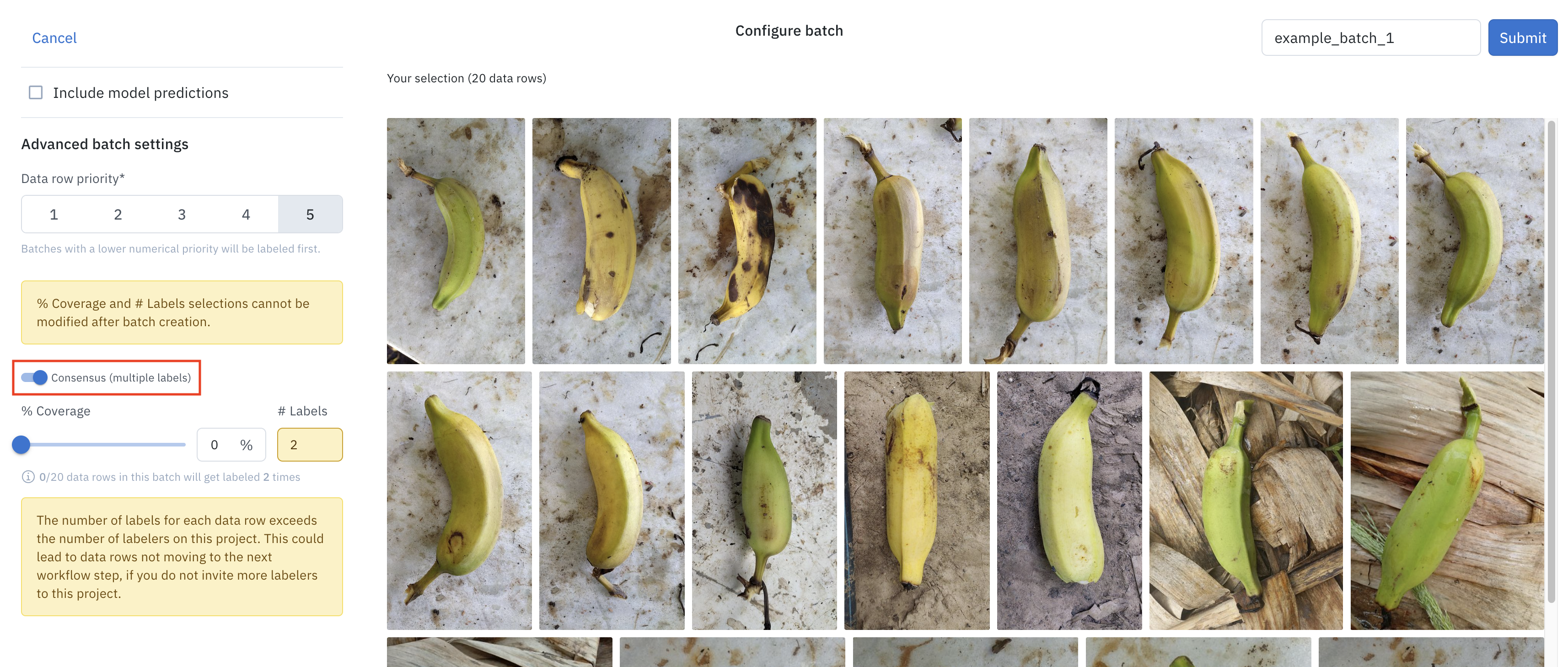 When adding data rows to an Annotate project, use the Queue batch option to enable consensus scoring and configure additional settings. You can’t change these settings after submission.