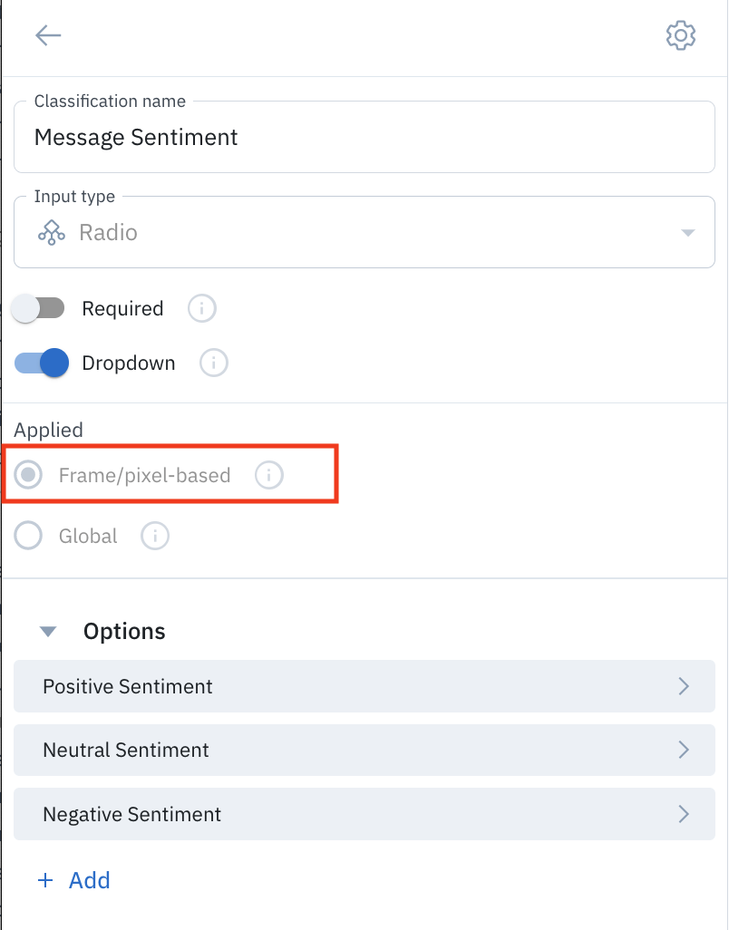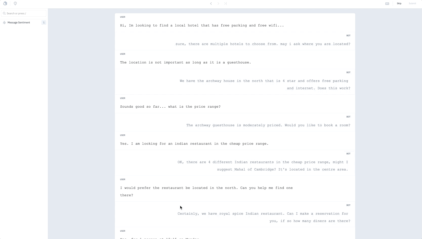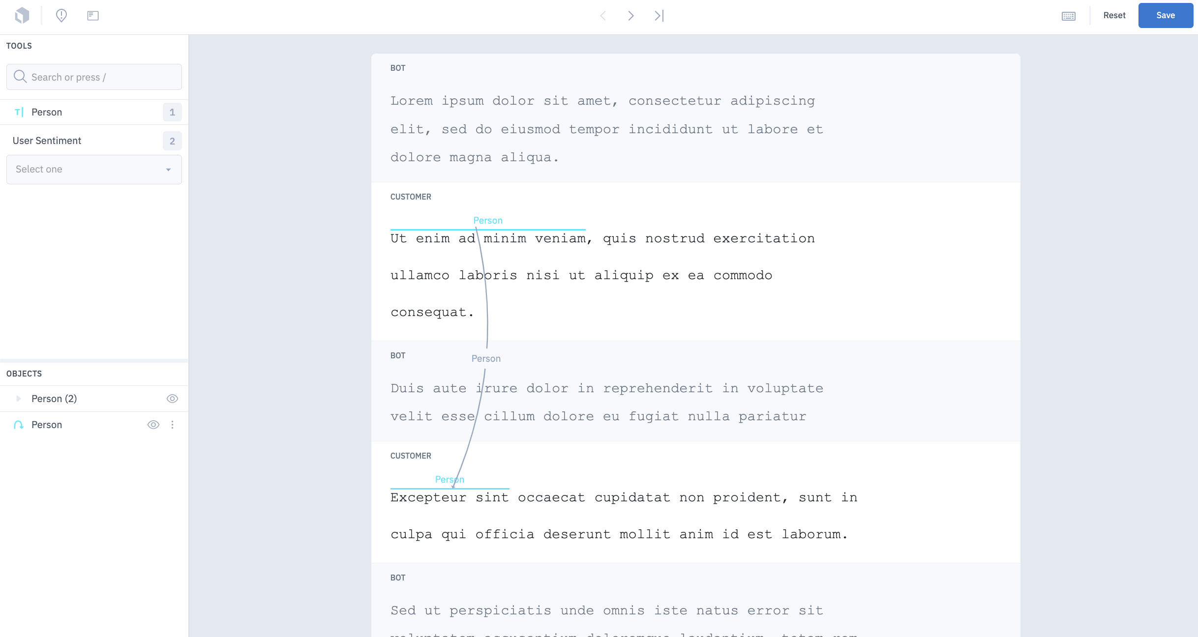 One unique feature of our conversation editor is the ability to label specific messages in a conversation with a radio classification value. This enables you to annotate messages with values such as intent or user sentiment.