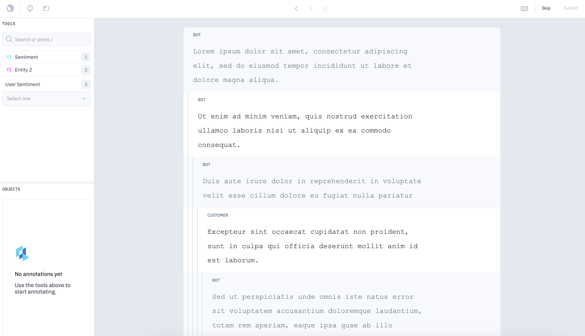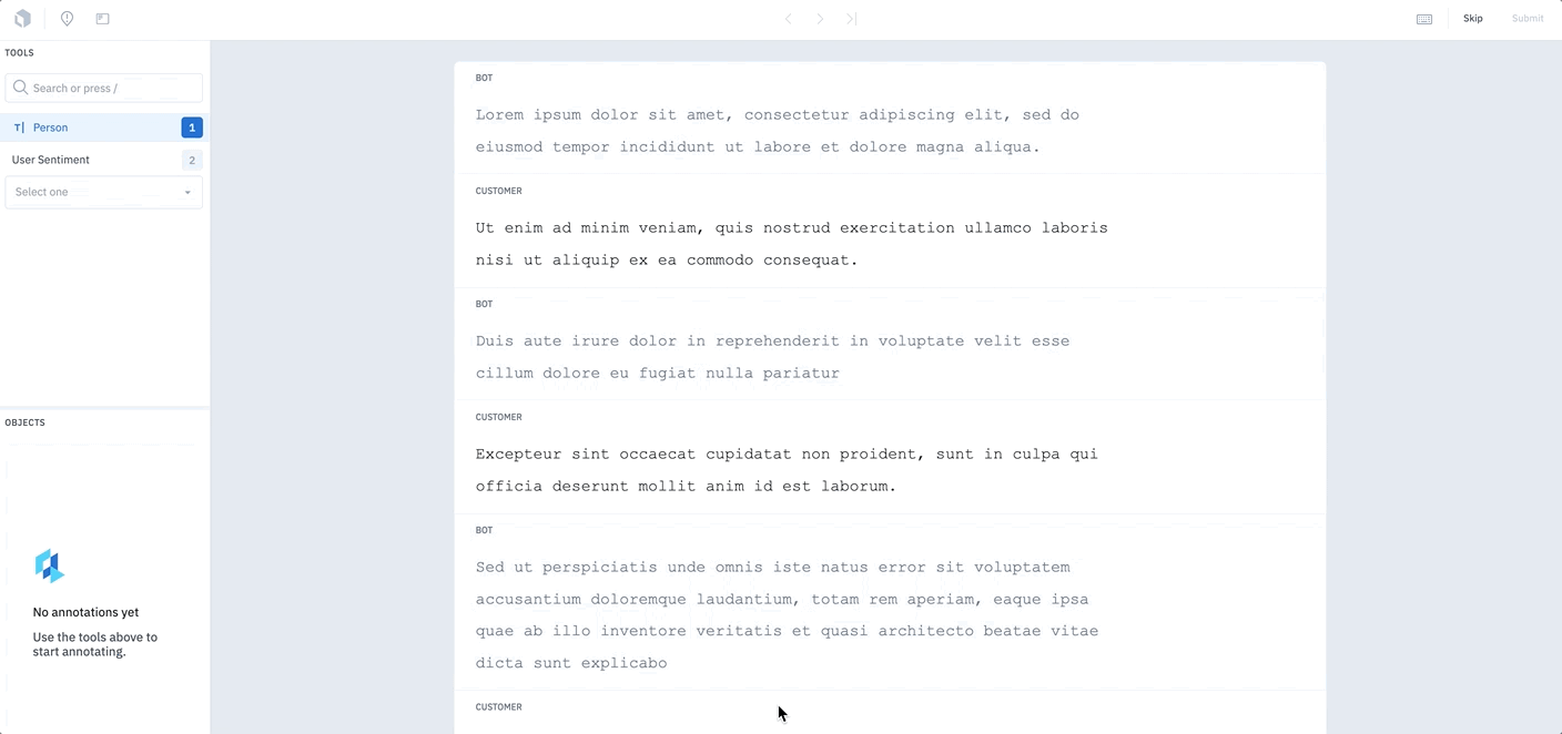 To learn how to import conversational text data, visit our documentation on importing conversational text.Supported annotation types