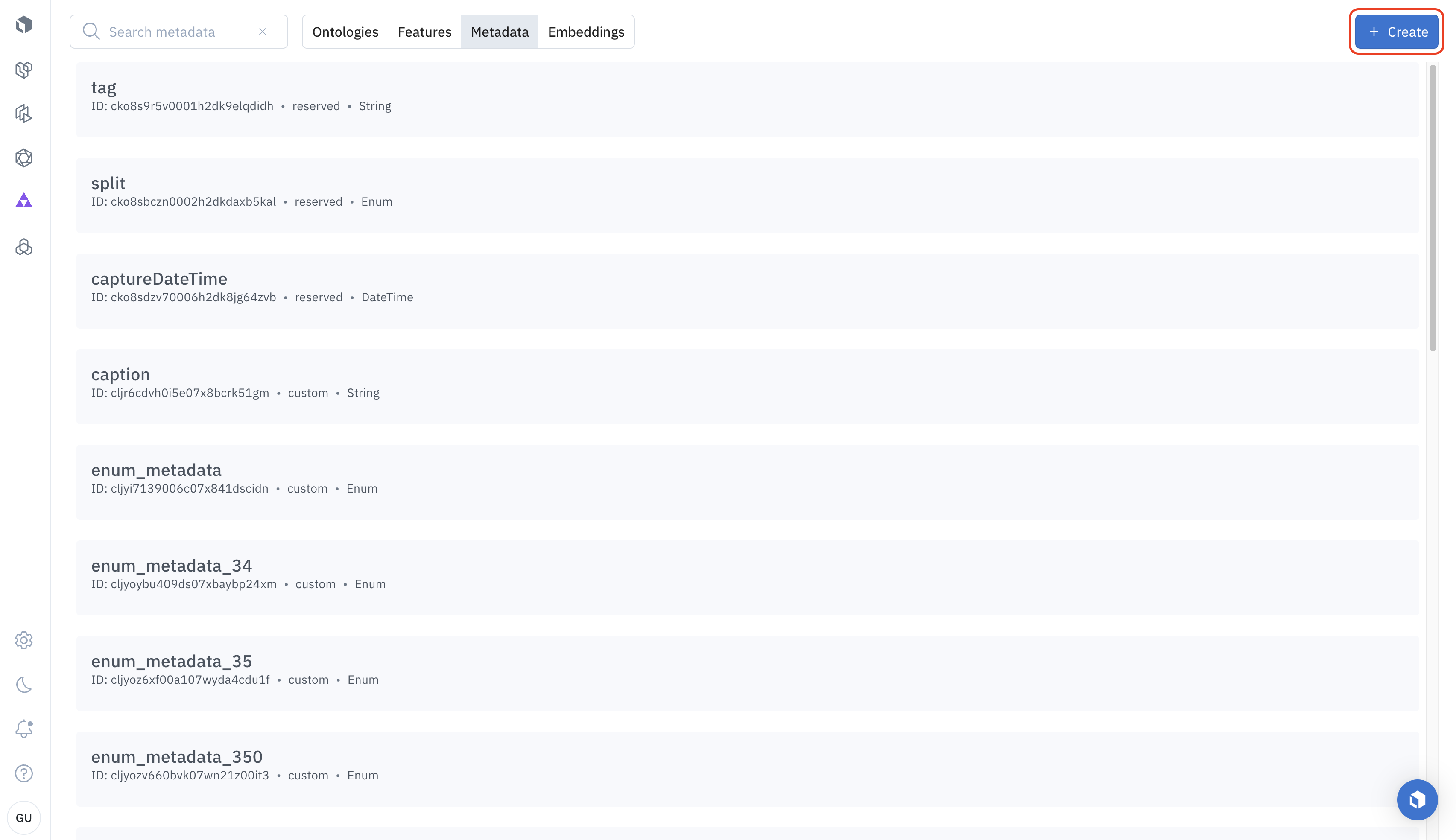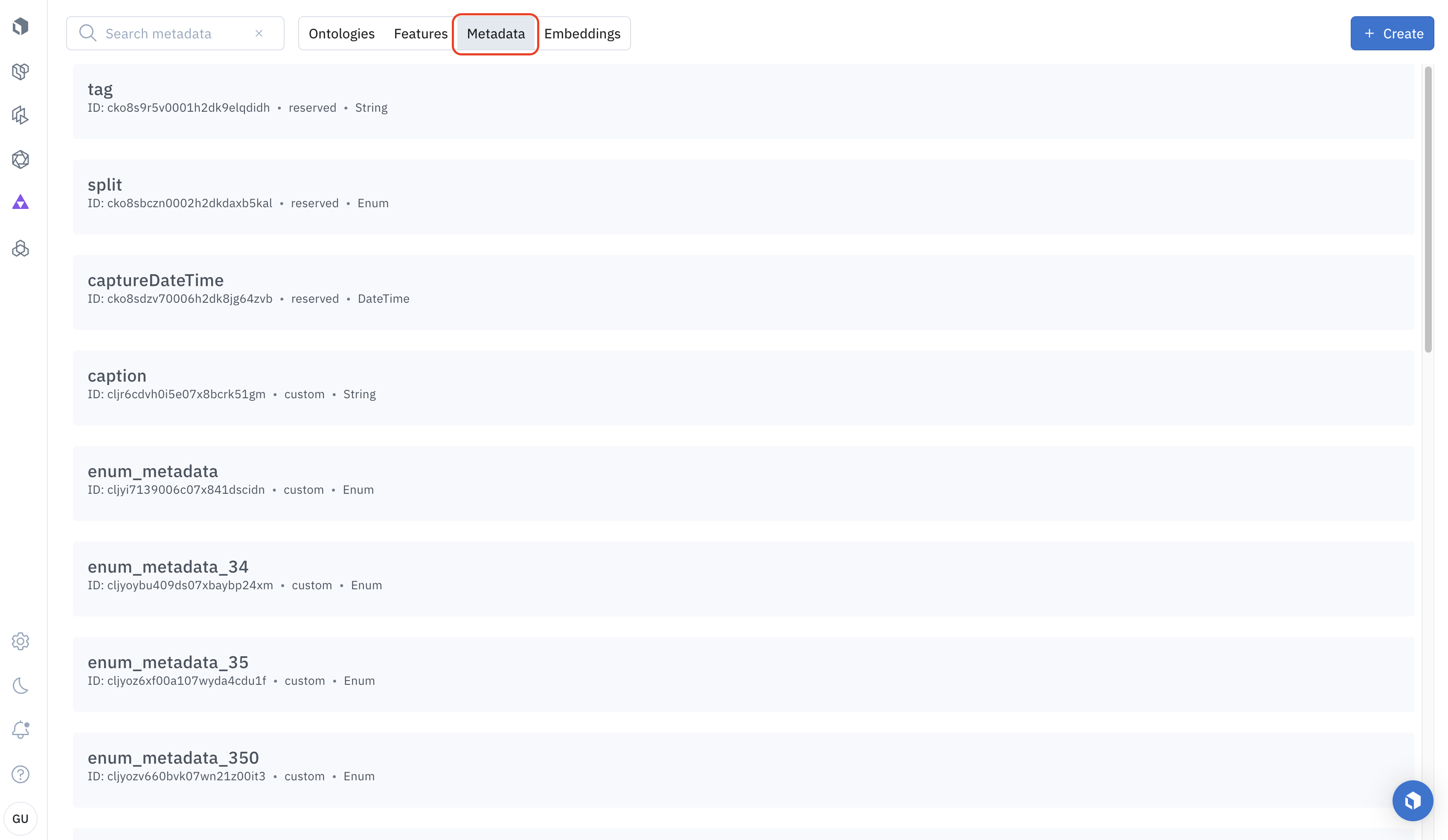 To create custom metadata fields via the UI, go to the Schema tab. Select Create.