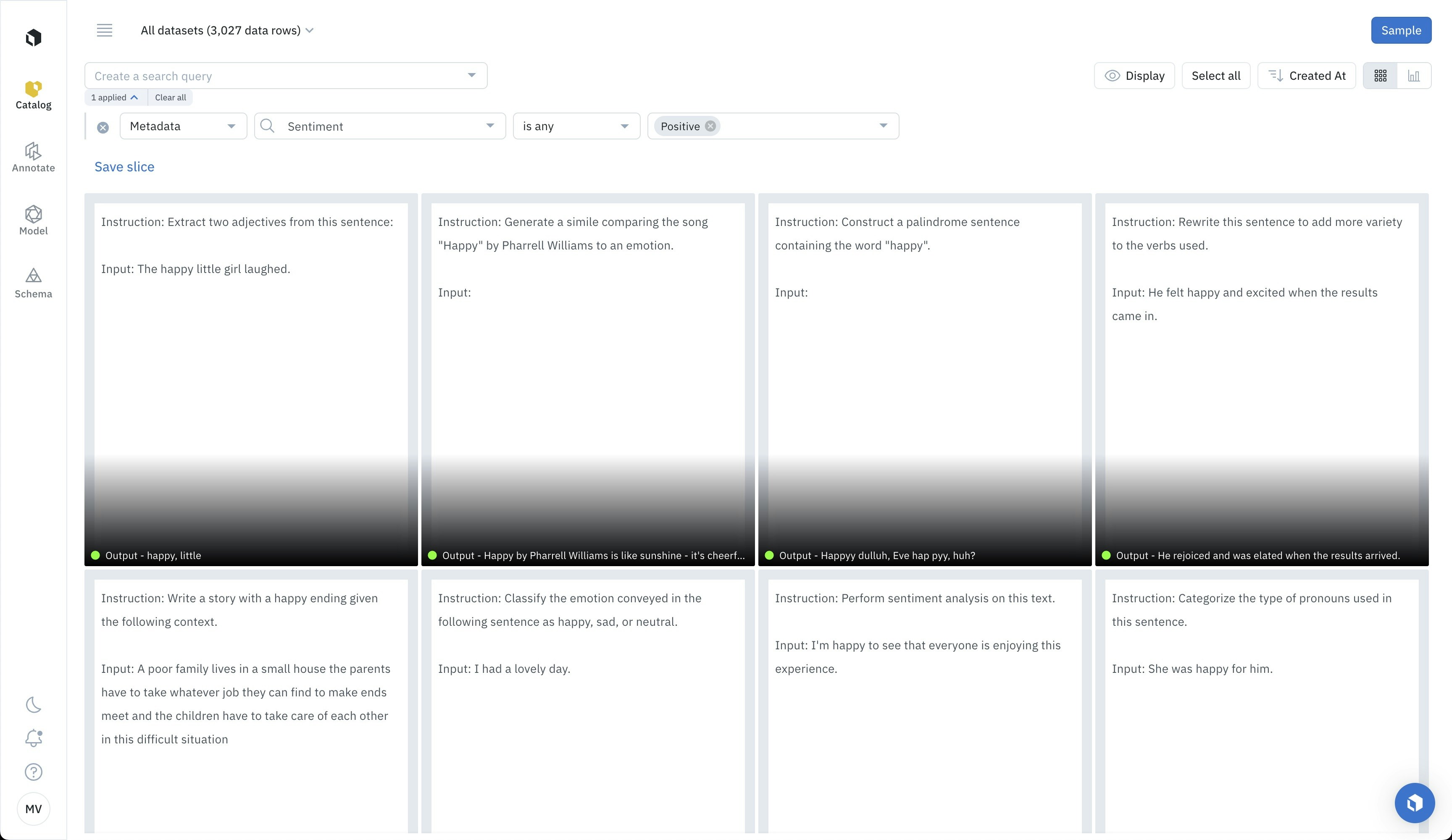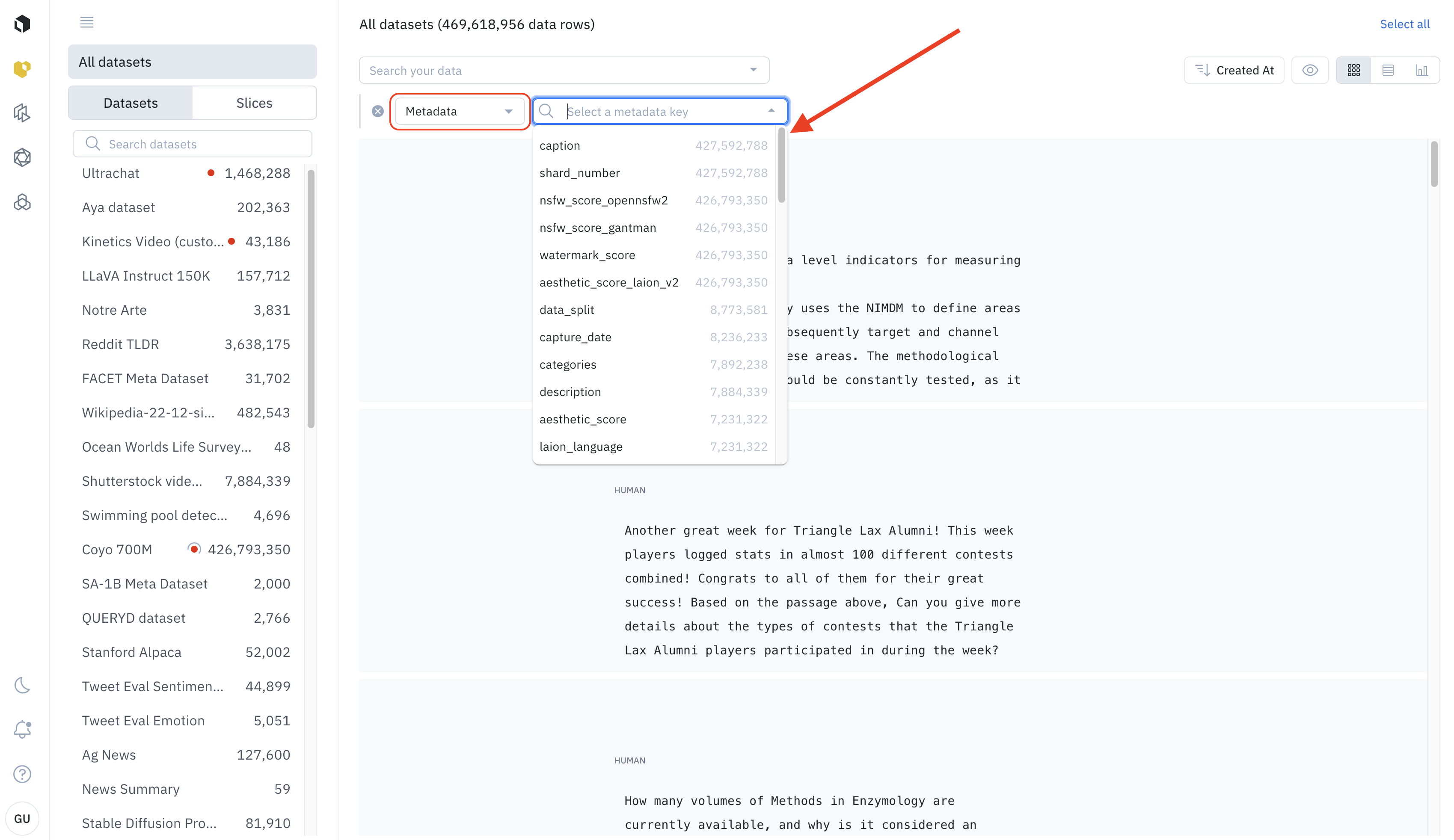 Once you upload your metadata, you can easily filter and view metadata in Catalog. If you want to label this set of data rows, you can filter by that metadata field and send them to a labeling project as a batch.Metadata viewing access