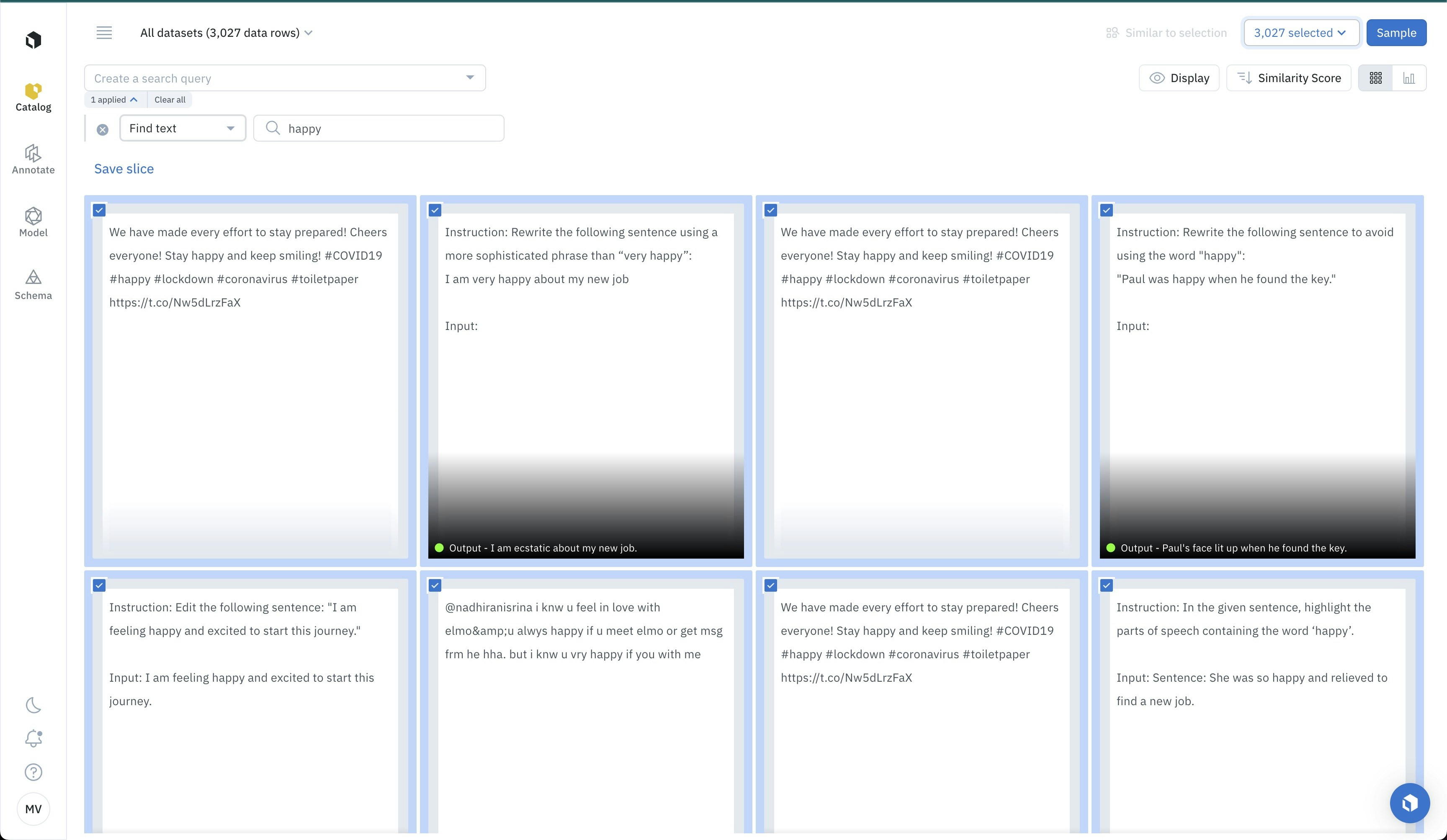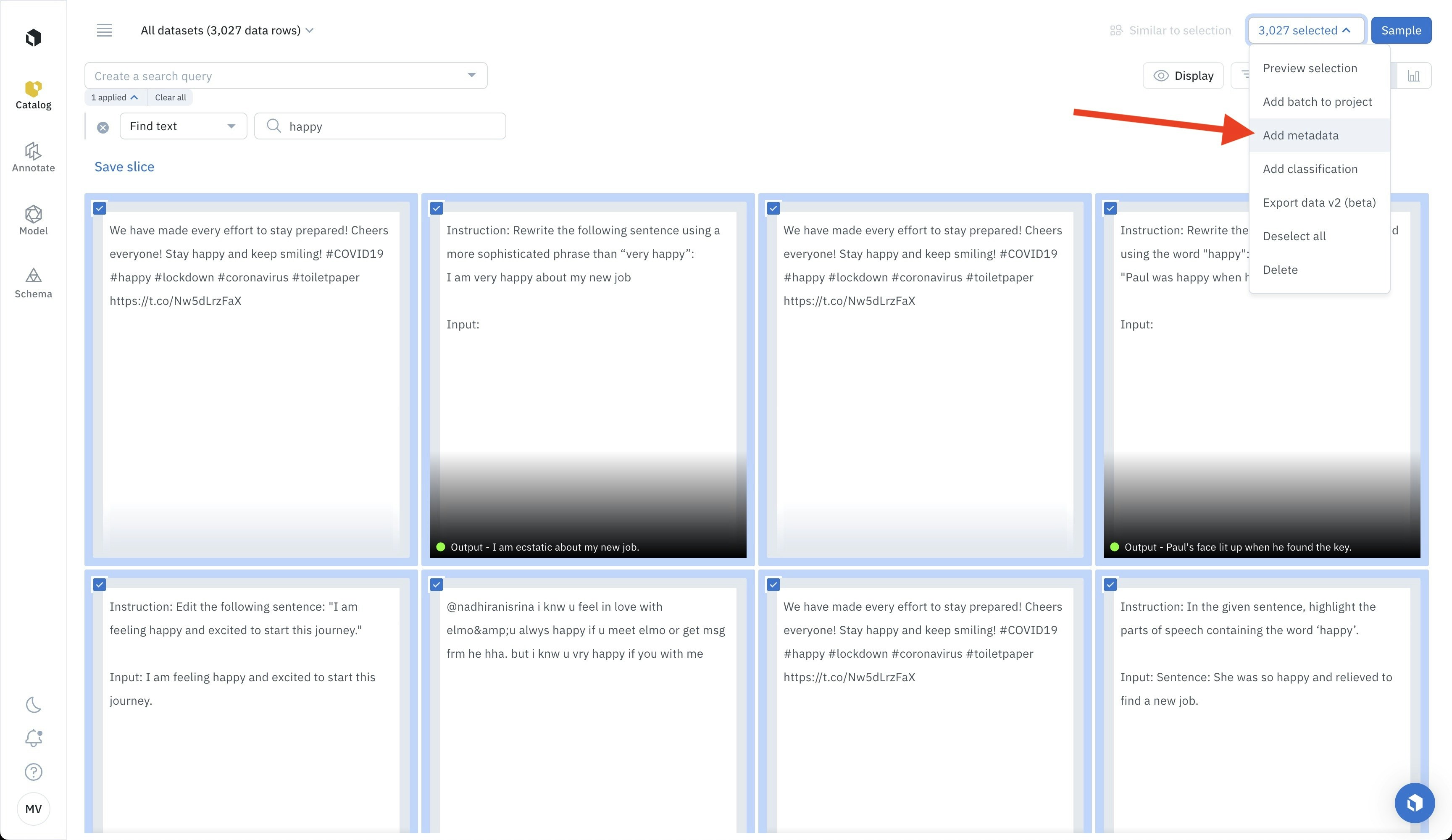 Follow these steps to bulk add metadata to your data rows in Catalog. See limits to learn the limits for bulk adding metadata to data rows in Catalog.Step 1: Select data rows