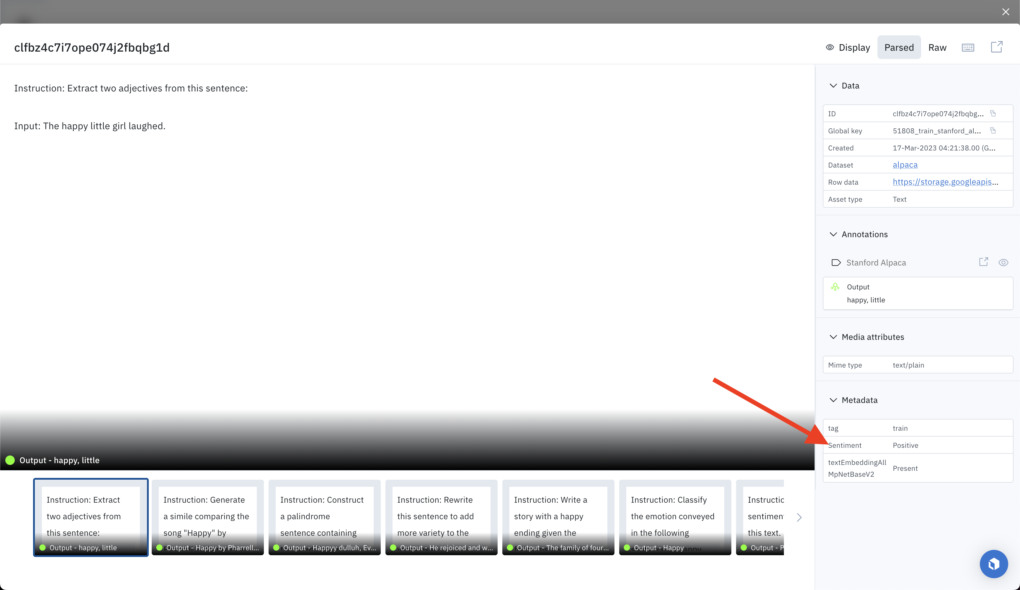 Here, only data rows with the metadata field "Sentiment" and value "Positive" are displayed.