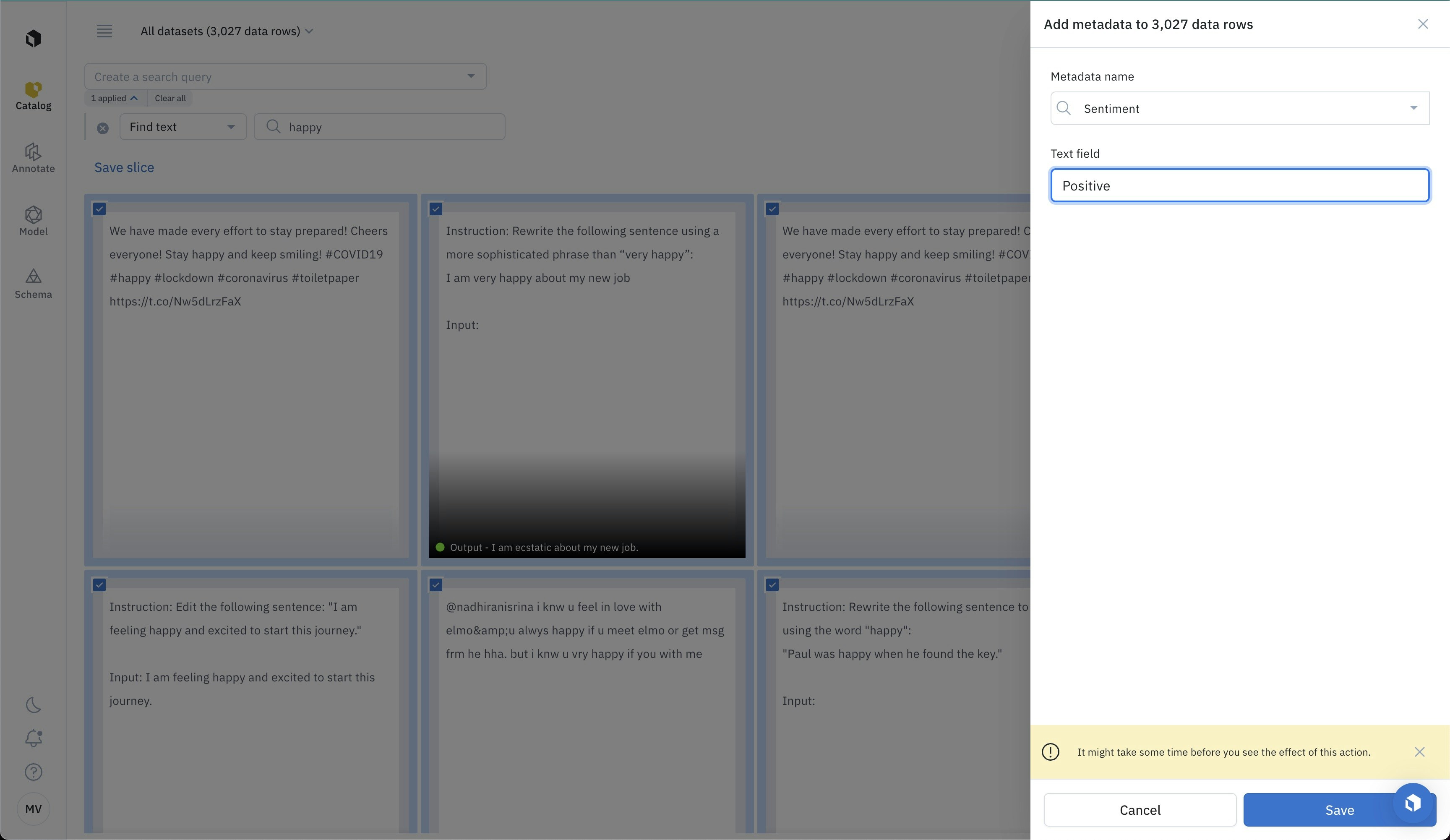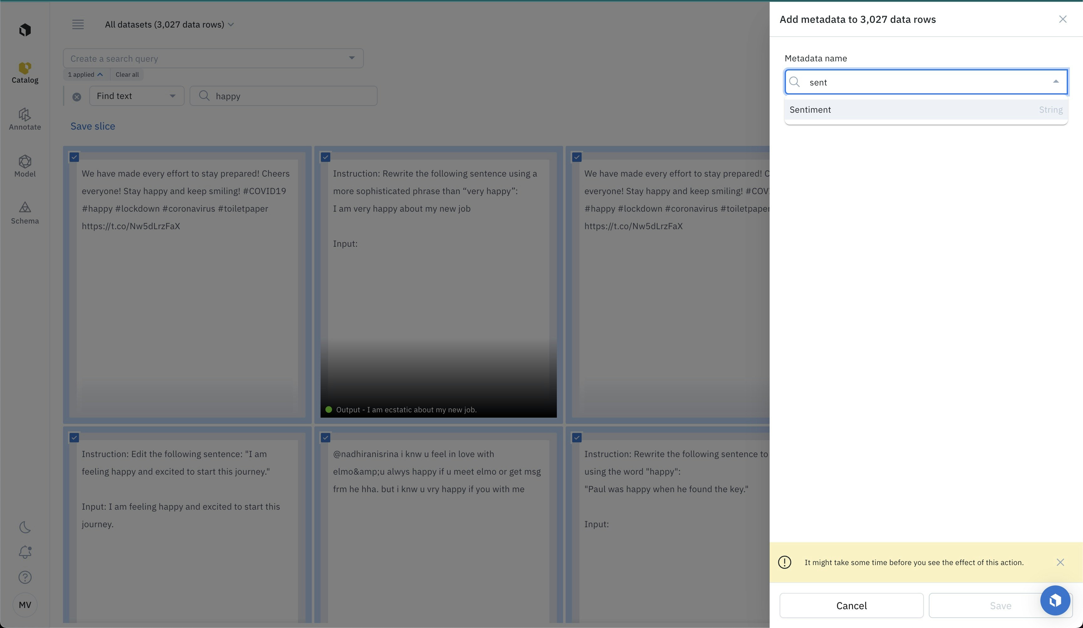 Enter a metadata value. This metadata field and value will apply to all selected data rows. Choose Save to apply the metadata in bulk. Changes can take time to be reflected in the data row metadata.