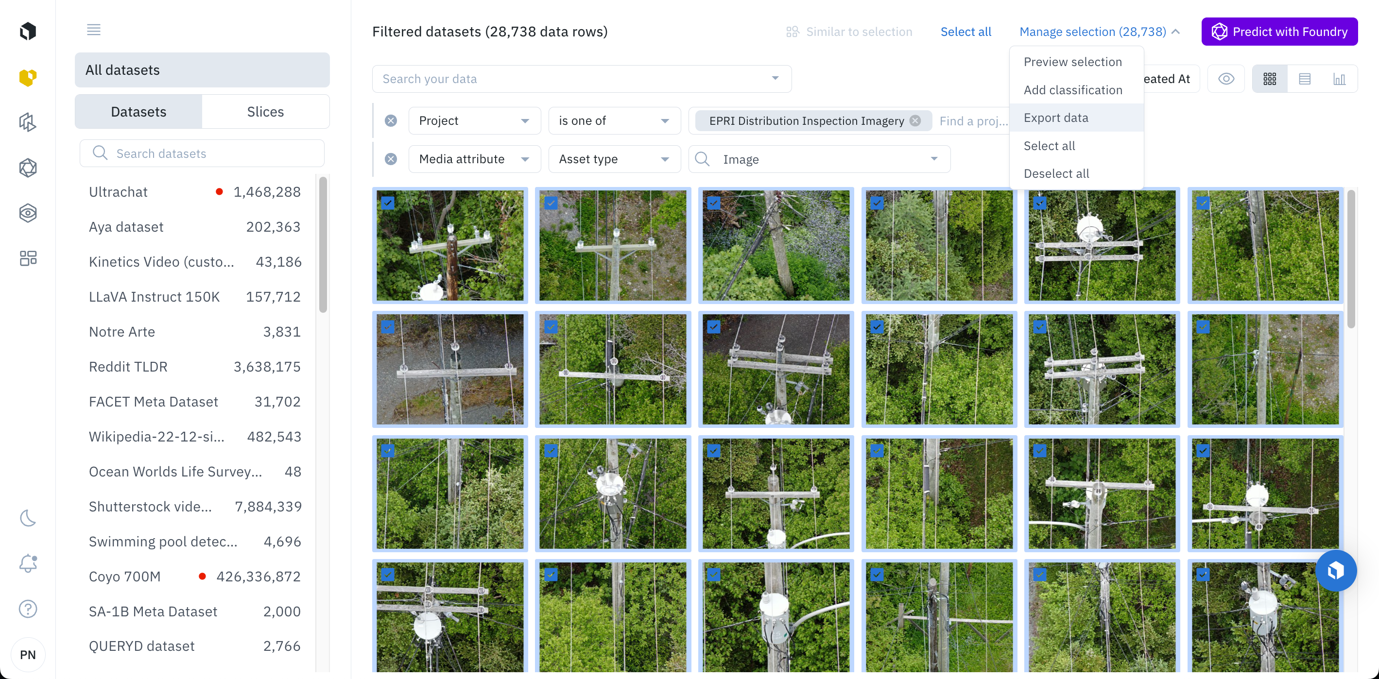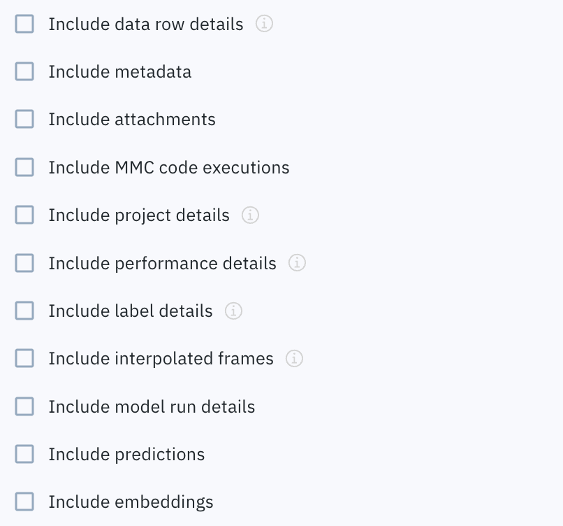 From the Catalog tab, you can apply and combine filters to query data rows based on similarity, natural language search, annotations, metadata, and more. Then, you can choose to include the associated project and/or model run information. Note that excluding optional fields from your export will make the process faster and the export file smaller.