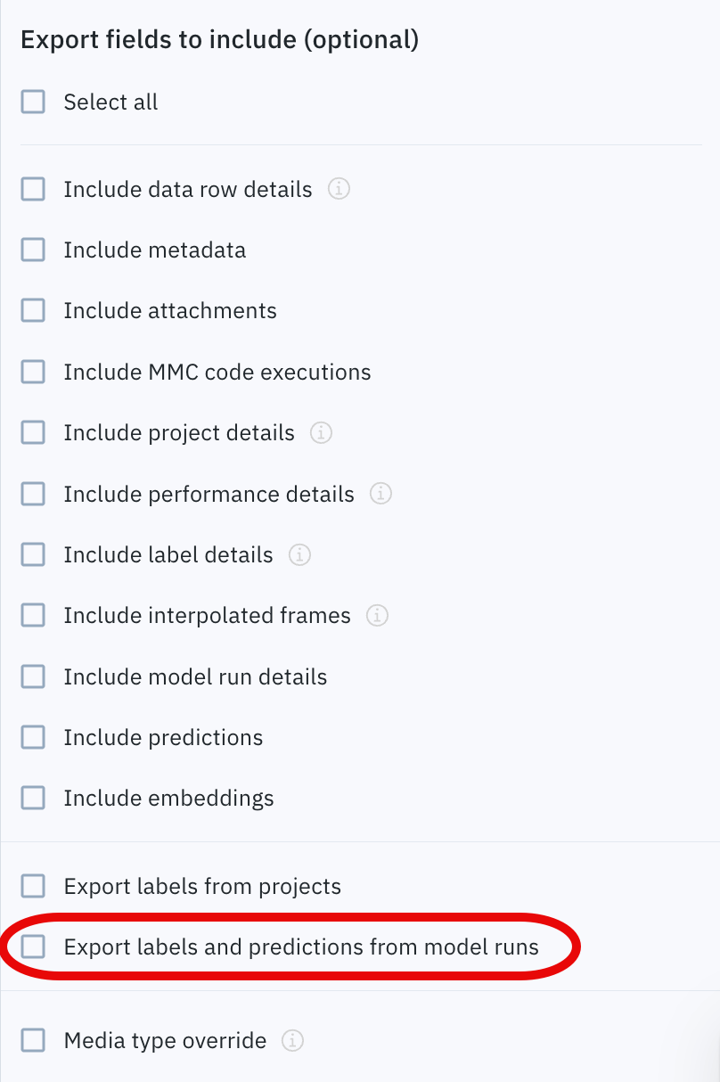 When you select Export labels and predictions from model runs, you will be prompted to select from the dropdown one or more model runs. Only model runs in which one or more of the selected data rows appear will appear in the dropdown. For the selected model runs, all labels and predictions made in the model run will be included in the NDJSON for each respective data row.
