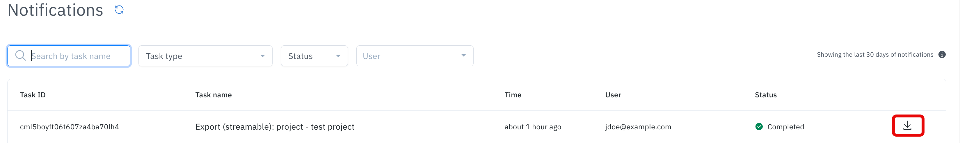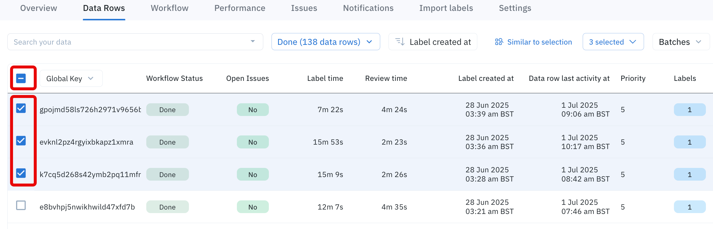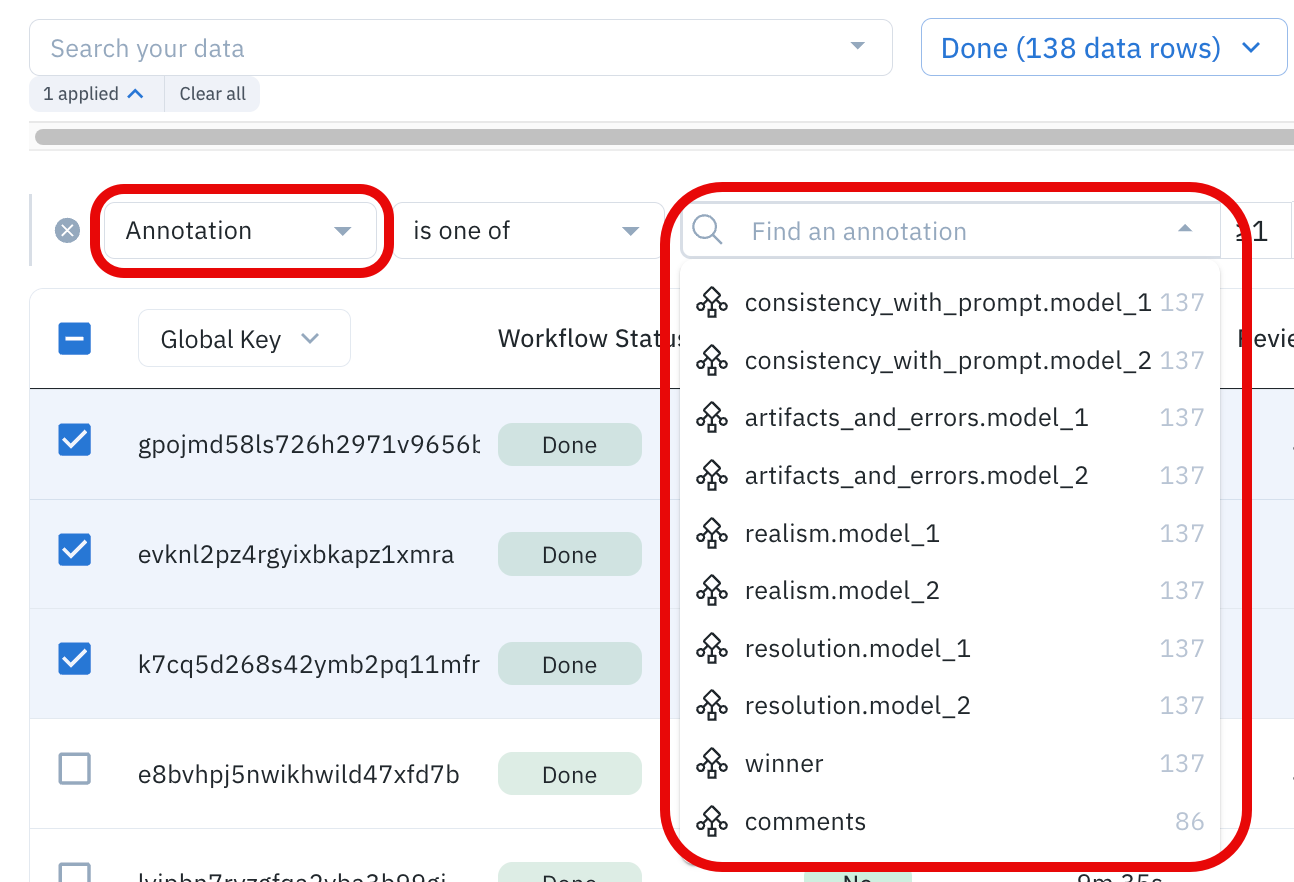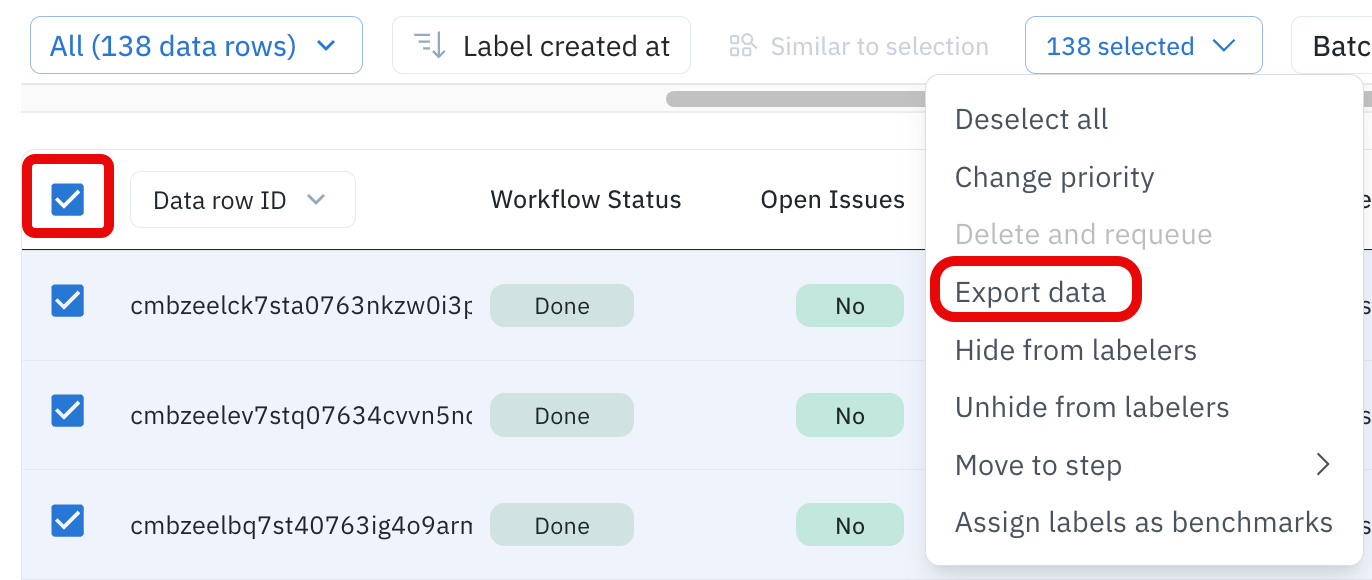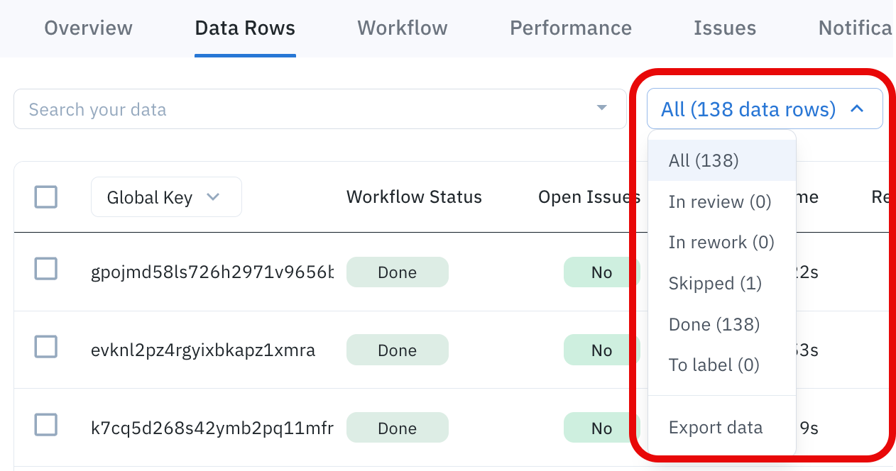 Follow these steps to filter and export data rows by label status.- Next to the “Search your data” field, select a label status (All, In review, In rework, Skipped, Done, To label). You may only select one label status at a time.