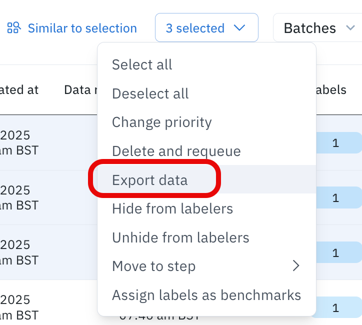 There are two ways to export all data rows from the Data Rows tab:- Select All (X data rows), then select Export data from the dropdown menu.