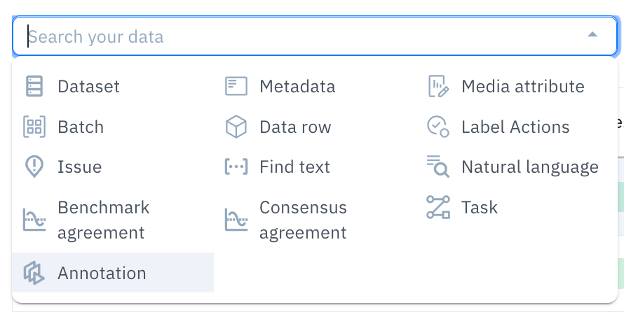 After selecting the label status, you can build your filters in the Data Rows tab to query for data rows that meet certain attributes (e.g., Dataset, Batch, Find text, Annotation, Metadata, etc). To filter and export data rows, follow these steps:- Click Search your data to display the filters.