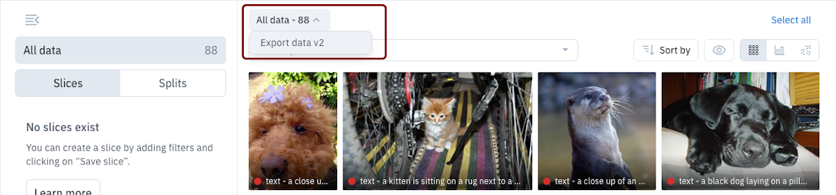 When you export predictions, an Export panel lists available options that vary according to the context of the export requests. Exporting from Catalog displays different options than exporting from Model or Annotate. You can choose to:- Select or deselect all current choices