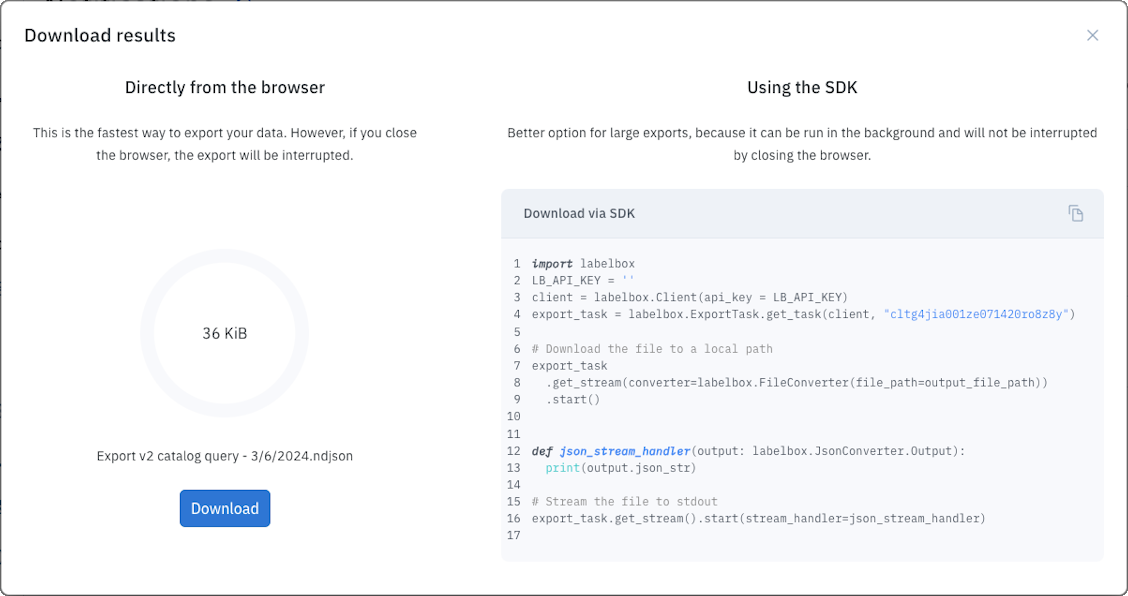 - The SDK to download the results. The Download results panel provides a sample script you can use to download results outside of your browser. This is a good choice for large datasets because they can handled in a background process. Use the Copy button to save the sample script to the Clipboard. You need Labelbox API key to run the script.