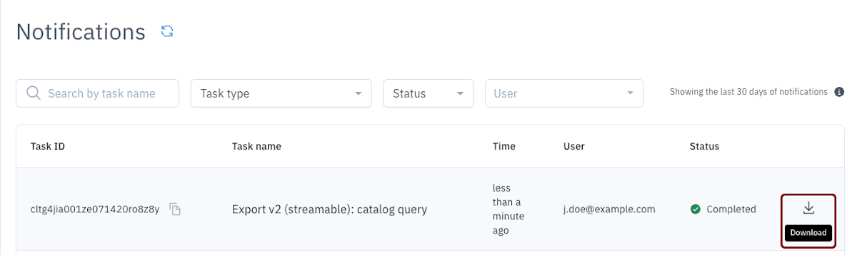 When your export results are ready, use the Download link in the Notification Center to download them. When you do this, the Download results prompt appears.