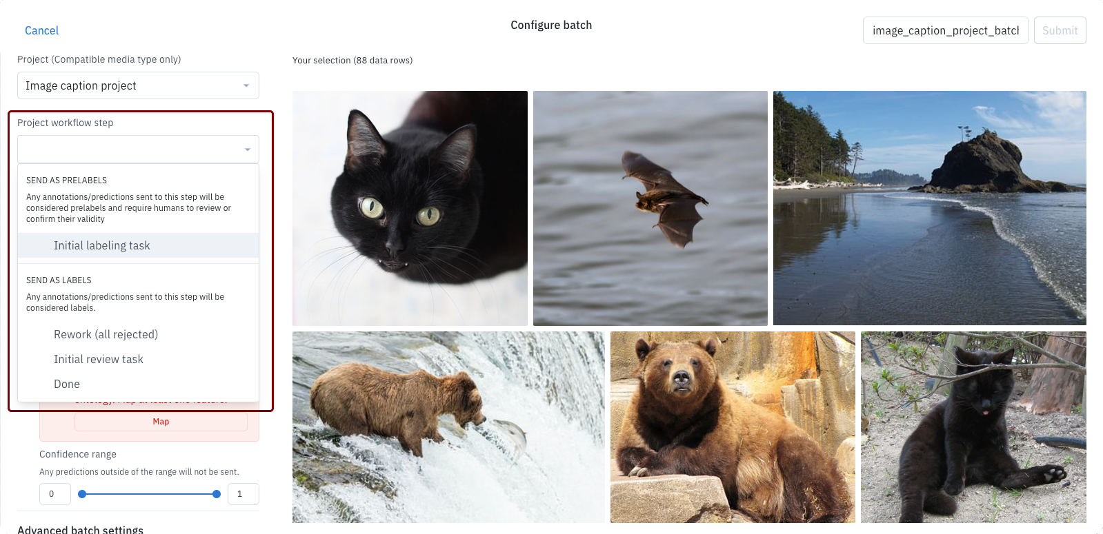 - Labels: Select the step where you want predictions to be assigned. You can choose between Rework (which rejects all pending labels), Initial review task, or Done. For help, see Workflows.