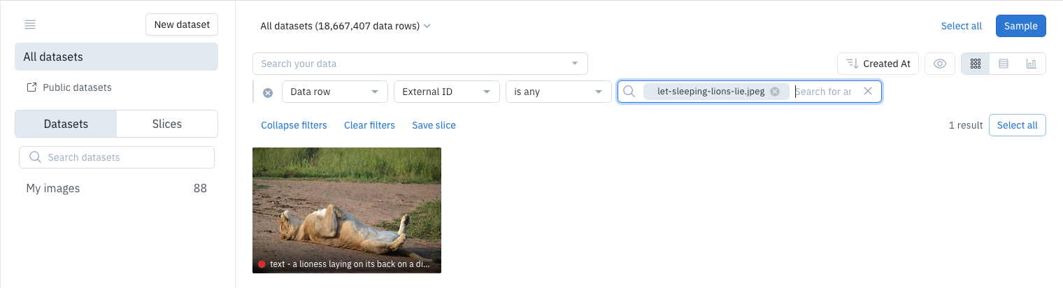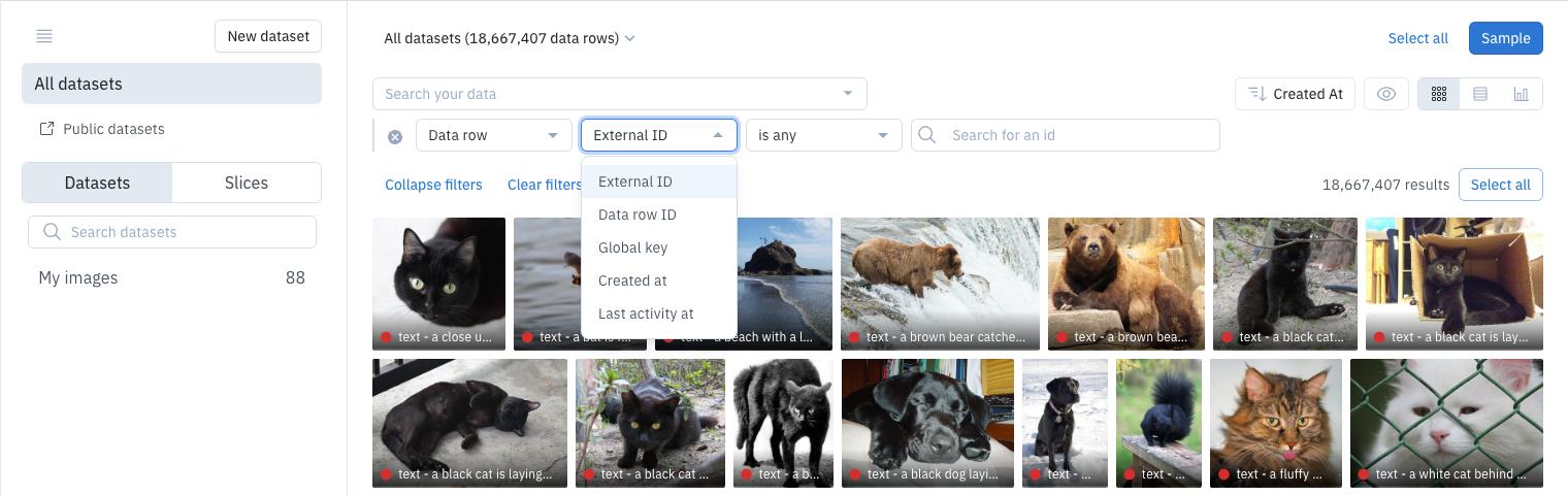 To use a Catalog filter to find a specific data row, you need to know its external ID, data row ID, or global key. To find a data row using one of these values:-
