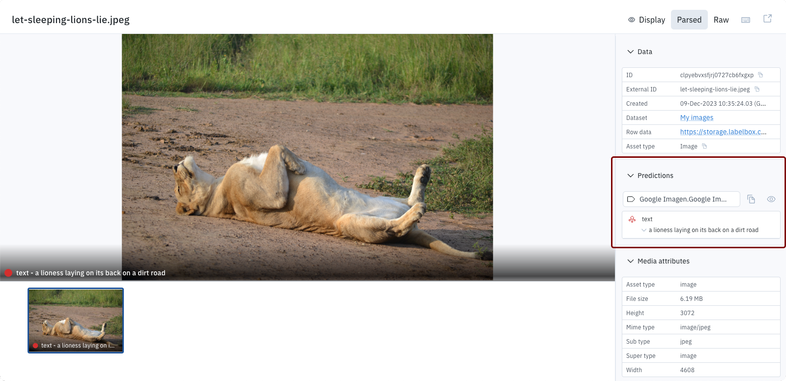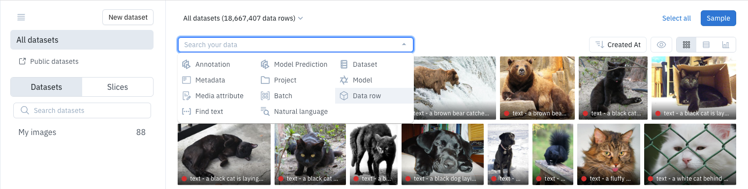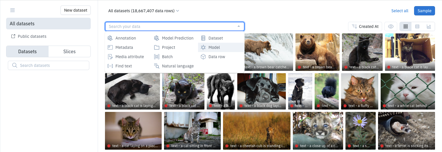 Predictions are stored as data row attributes. To view them, open data rows in Catalog. You can use Catalog filters to view individual data rows or to find data rows in a model run.Find a single data row