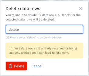 Note that data rows and additional details, such as annotations (label), metadata, classifications, and so on, are permanently removed. Use care when deleting data rows; this is a permanent action that cannot be reversed.