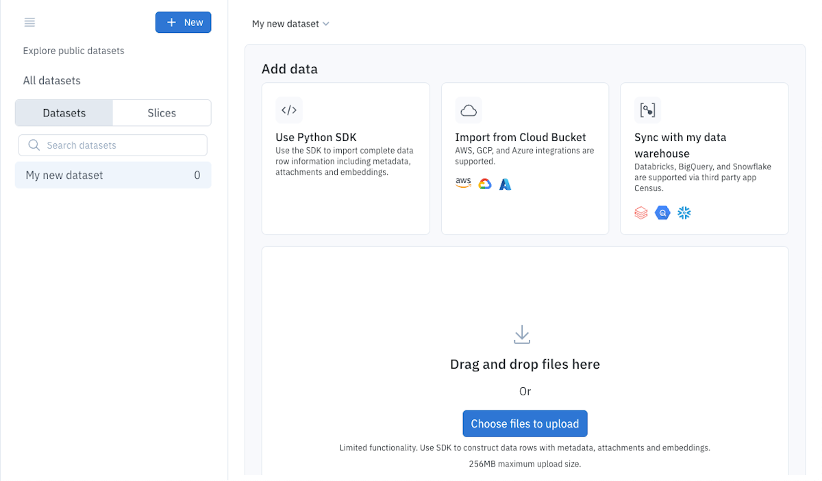 From the dataset default view, select Choose files to upload